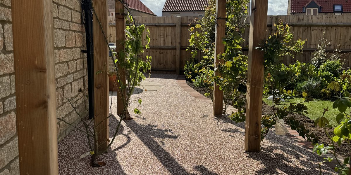 This gorgeous blend of orange, red and white creates a warm and light tone, perfect to create a timeless surface that makes your patio feel like an extension of your garden. These tones harmonise perfectly with plants, stone and wood that creates a dynamic, organic look that compliments the whole garden. These clients chose to have a block paving border running around their garden in a similar colour to the resin, this creates a softer, cohesive look to the garden, making it a peaceful and calm aesthetic to enjoy.