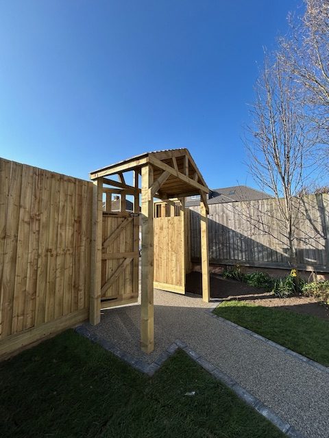 To frame the space and enhance privacy, new fencing was installed, chosen for both durability and style. The standout feature, though, is a bespoke wooden structure—a unique architectural element that adds warmth, character, and a touch of individuality to the property. Together, these upgrades deliver a balanced blend of practicality and design, transforming the entrance into a welcoming, modern, and highly functional outdoor area.